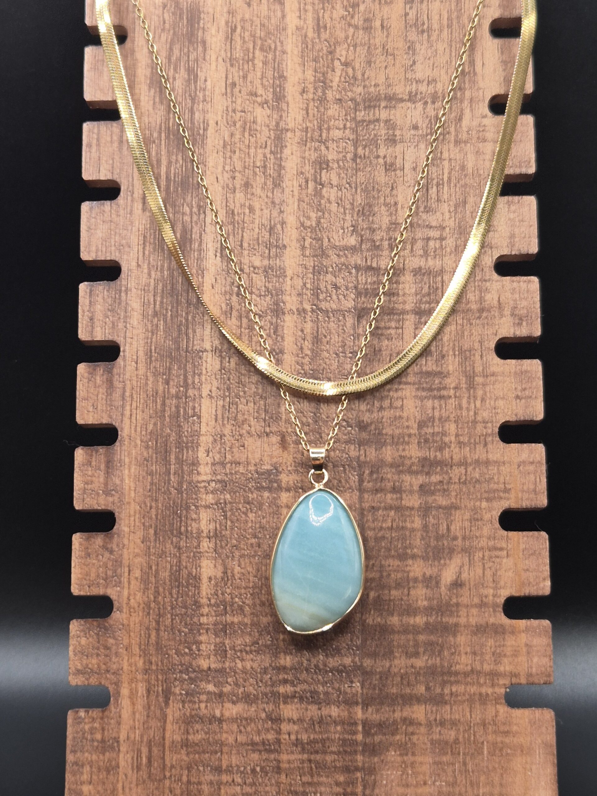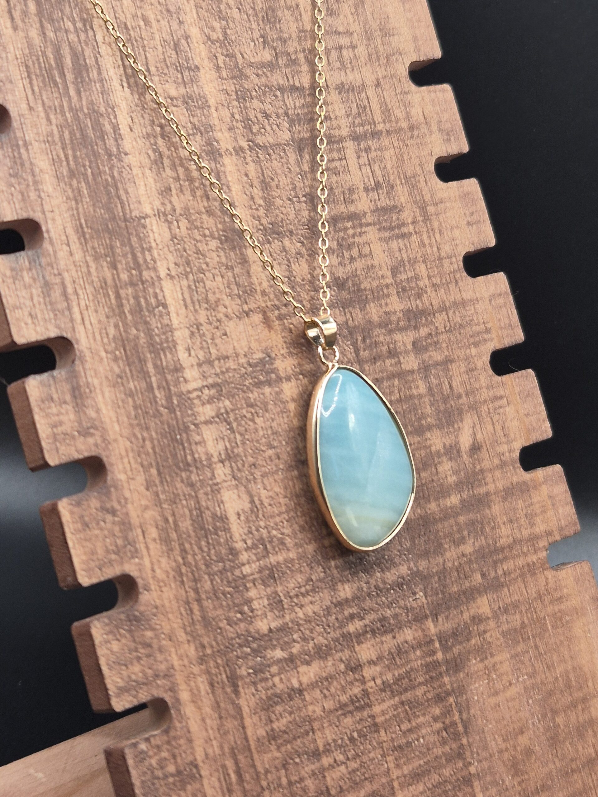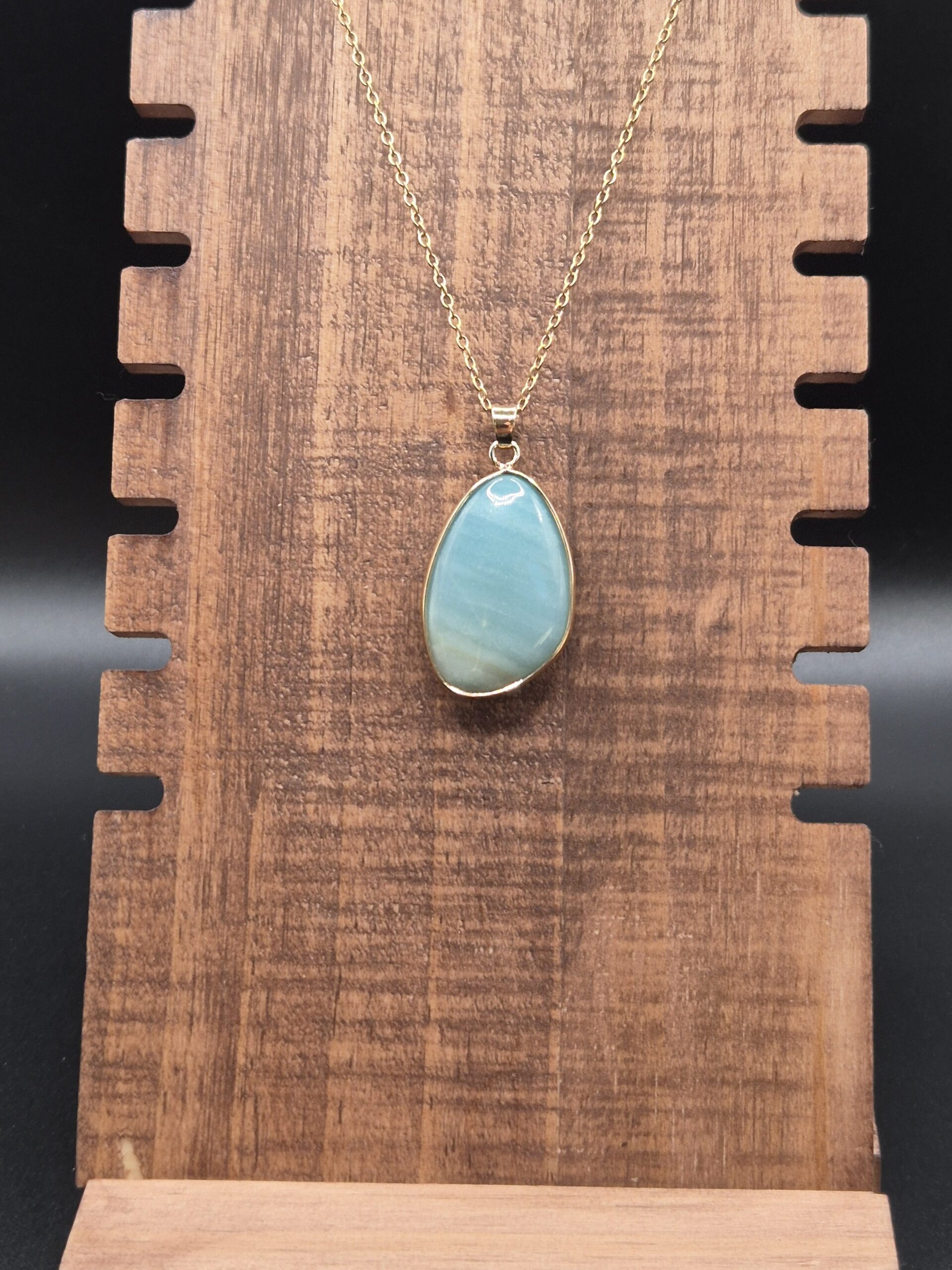 Diese Halskette verbindet einen glatt polierten, eingefassten Amazonit