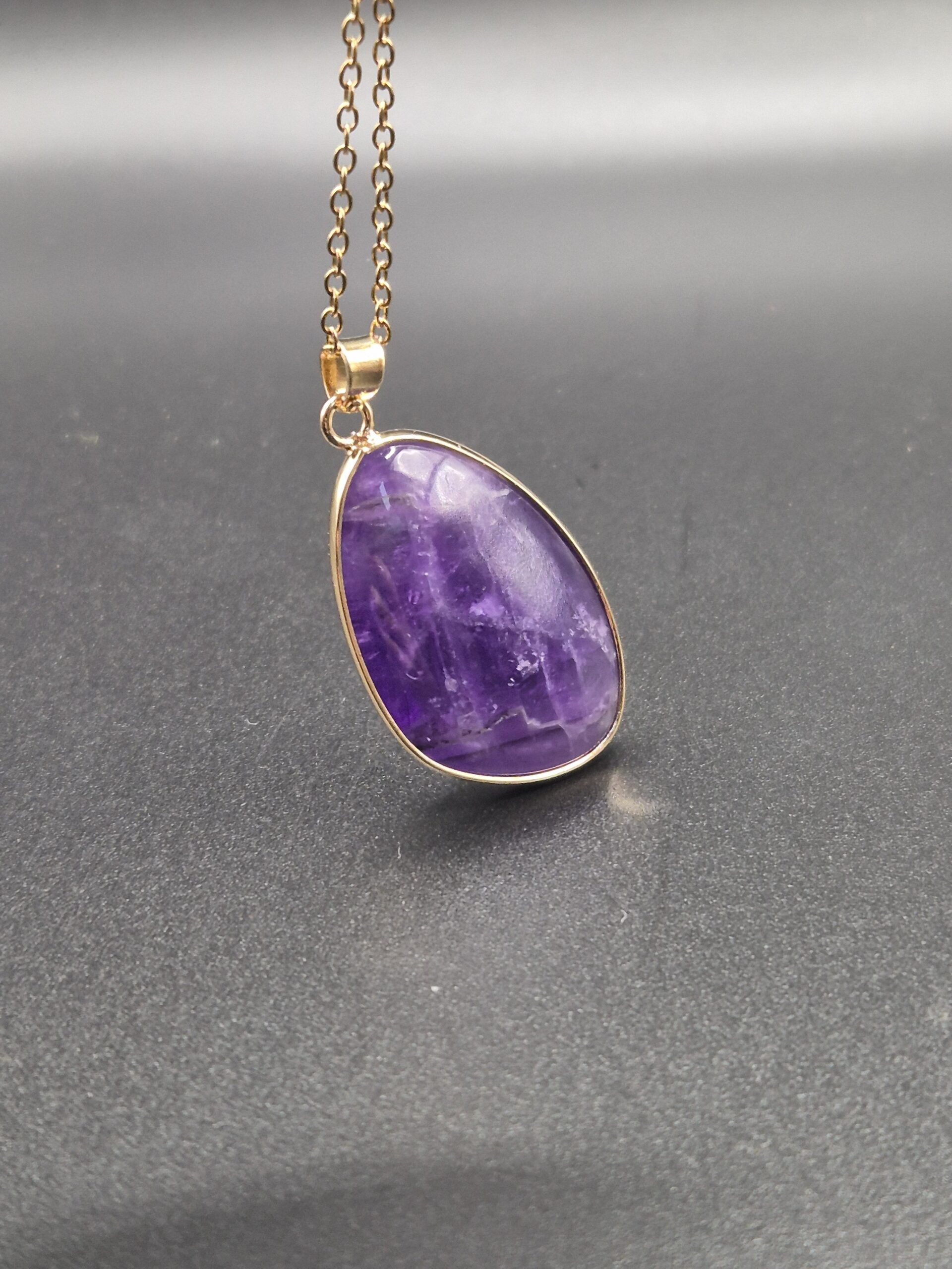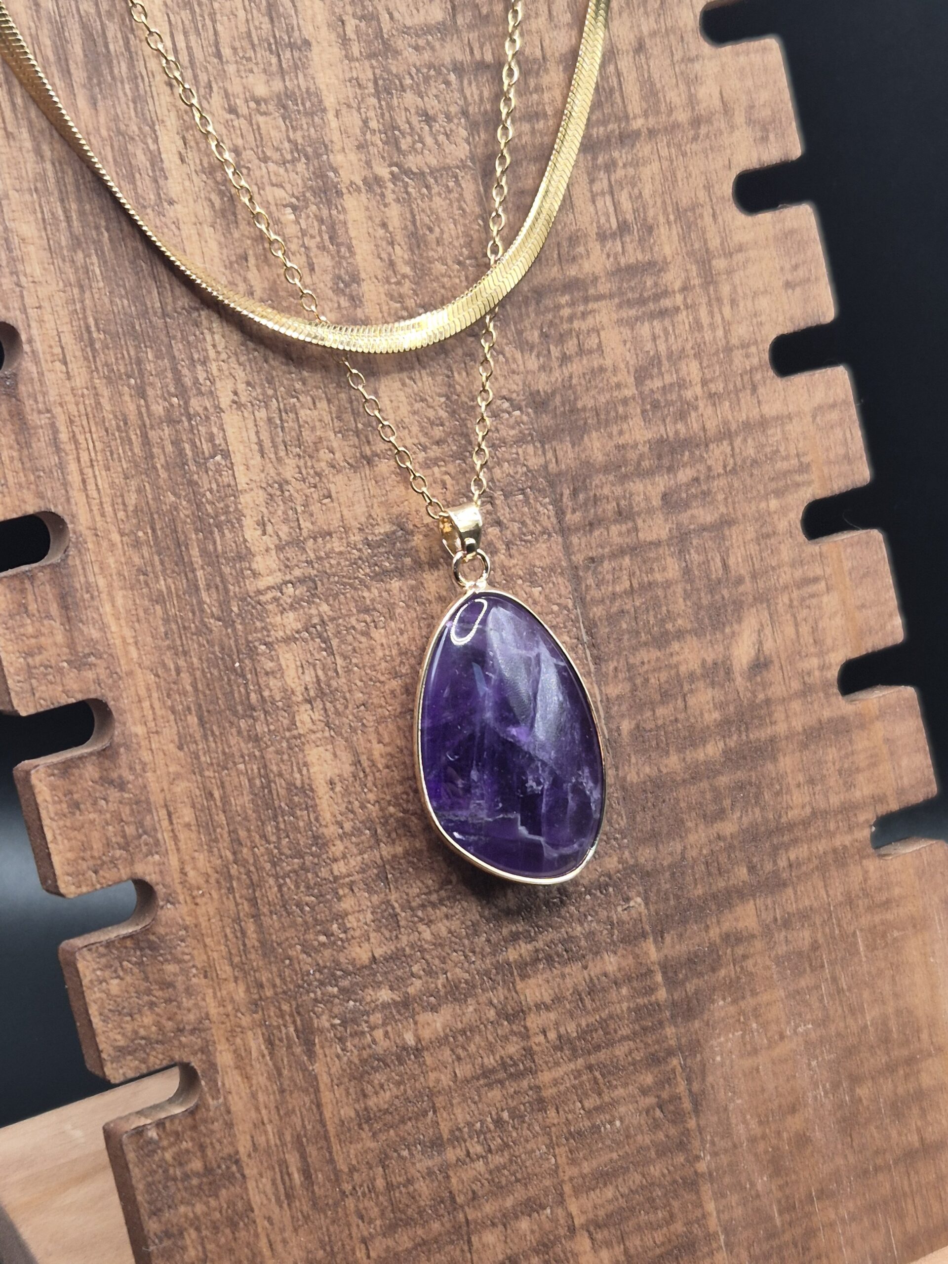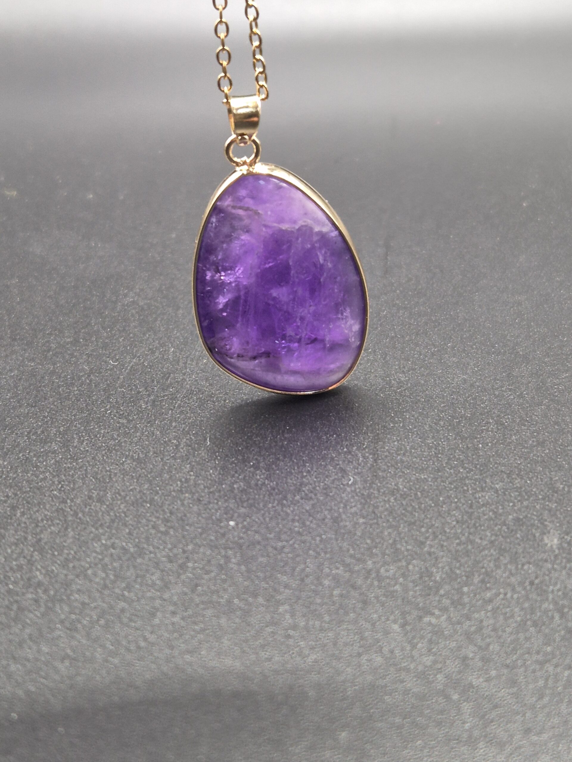 Polierte Amethyst Kette mit goldfarbener Edelstahlfassung.