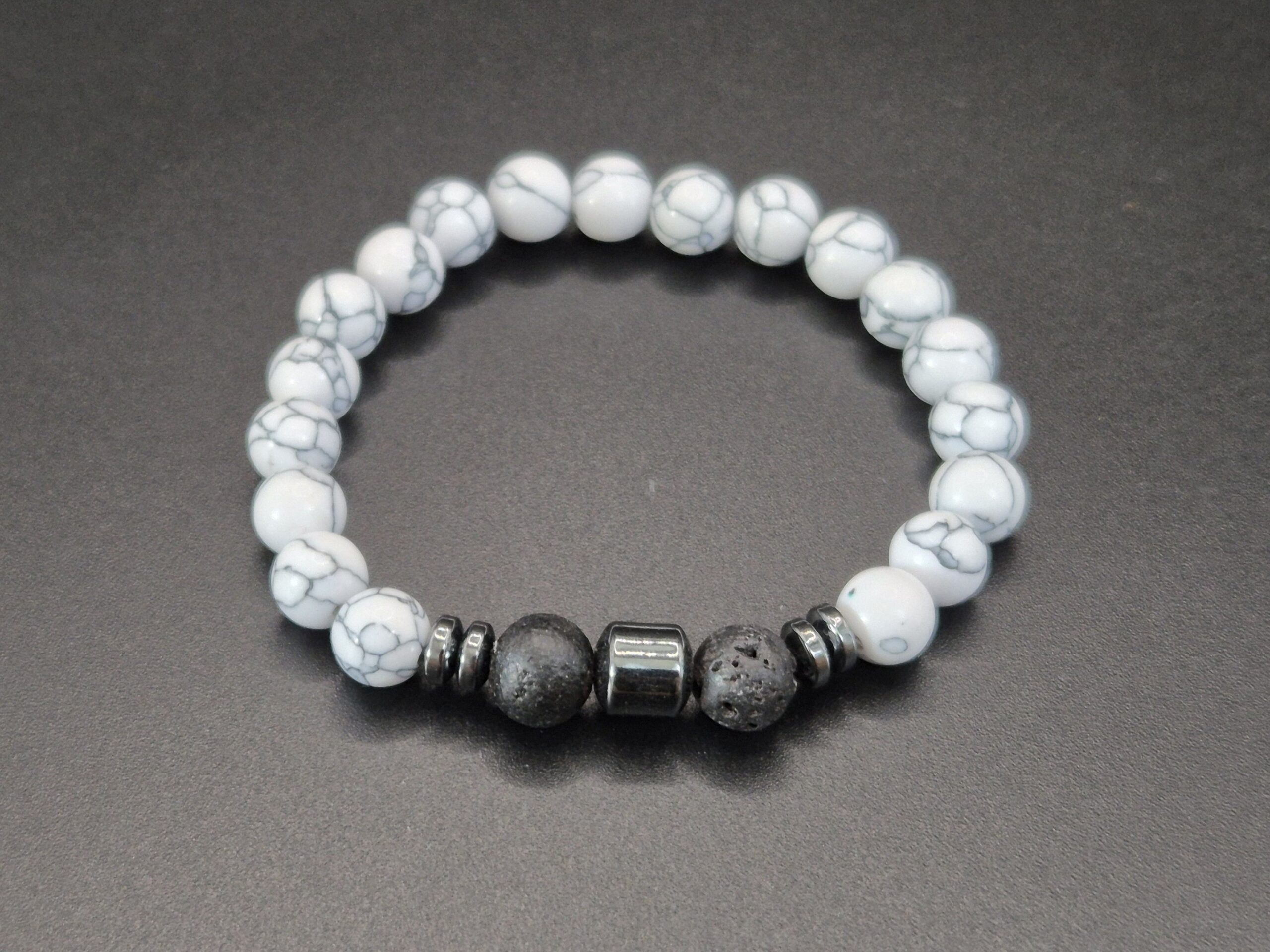 Armband aus 8mm Howlithperlen, verziert mit Lavaperlen und Metallelementen