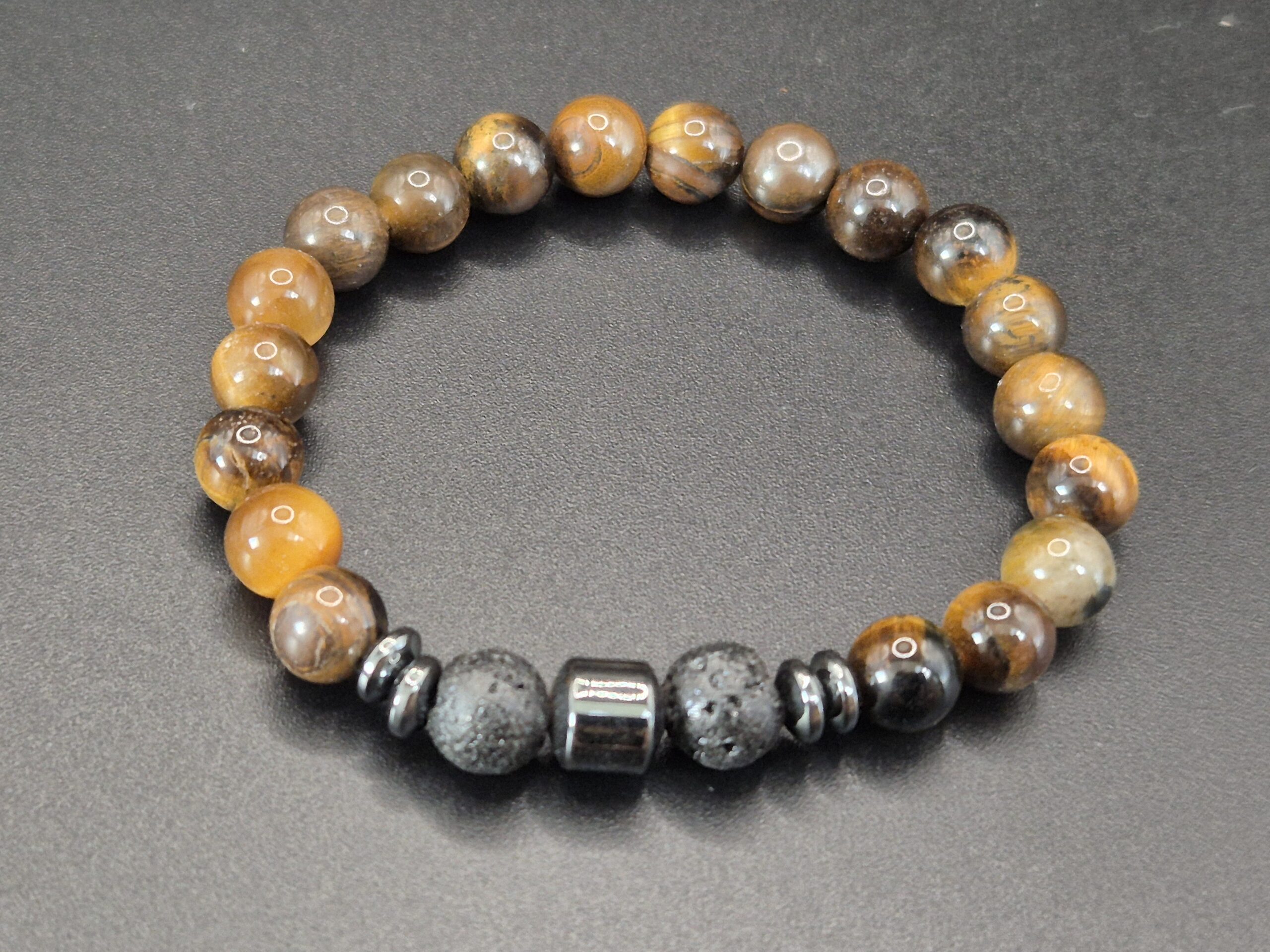 Dieses Armband vereint Tigerauge, Lavaperlen und Metallelemente zu einer kraftvollen Kombination.