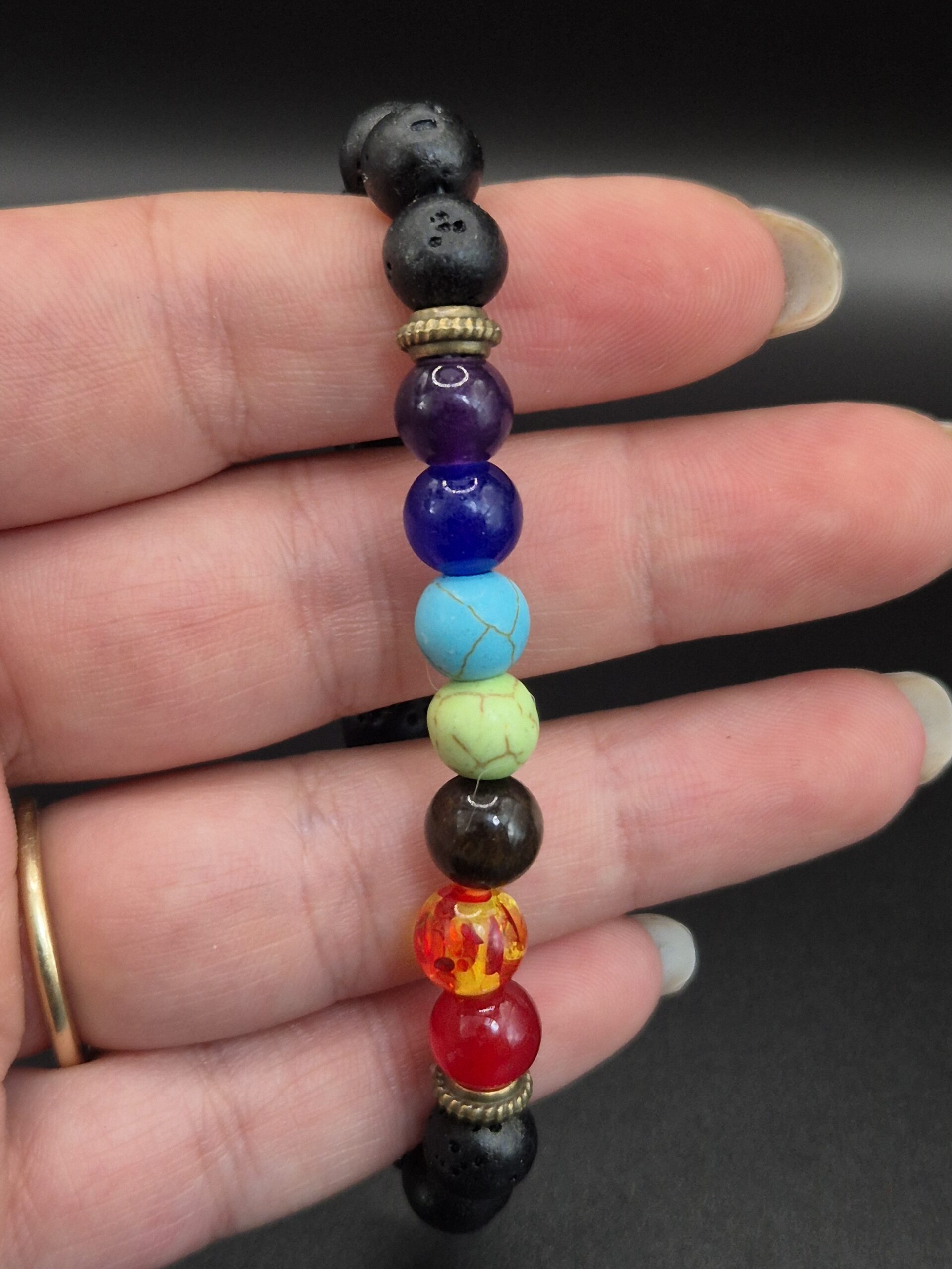 Dieses Chakren-Armband vereint Lavaperlen und farbige Glasperlen zu einer ausgewogenen,