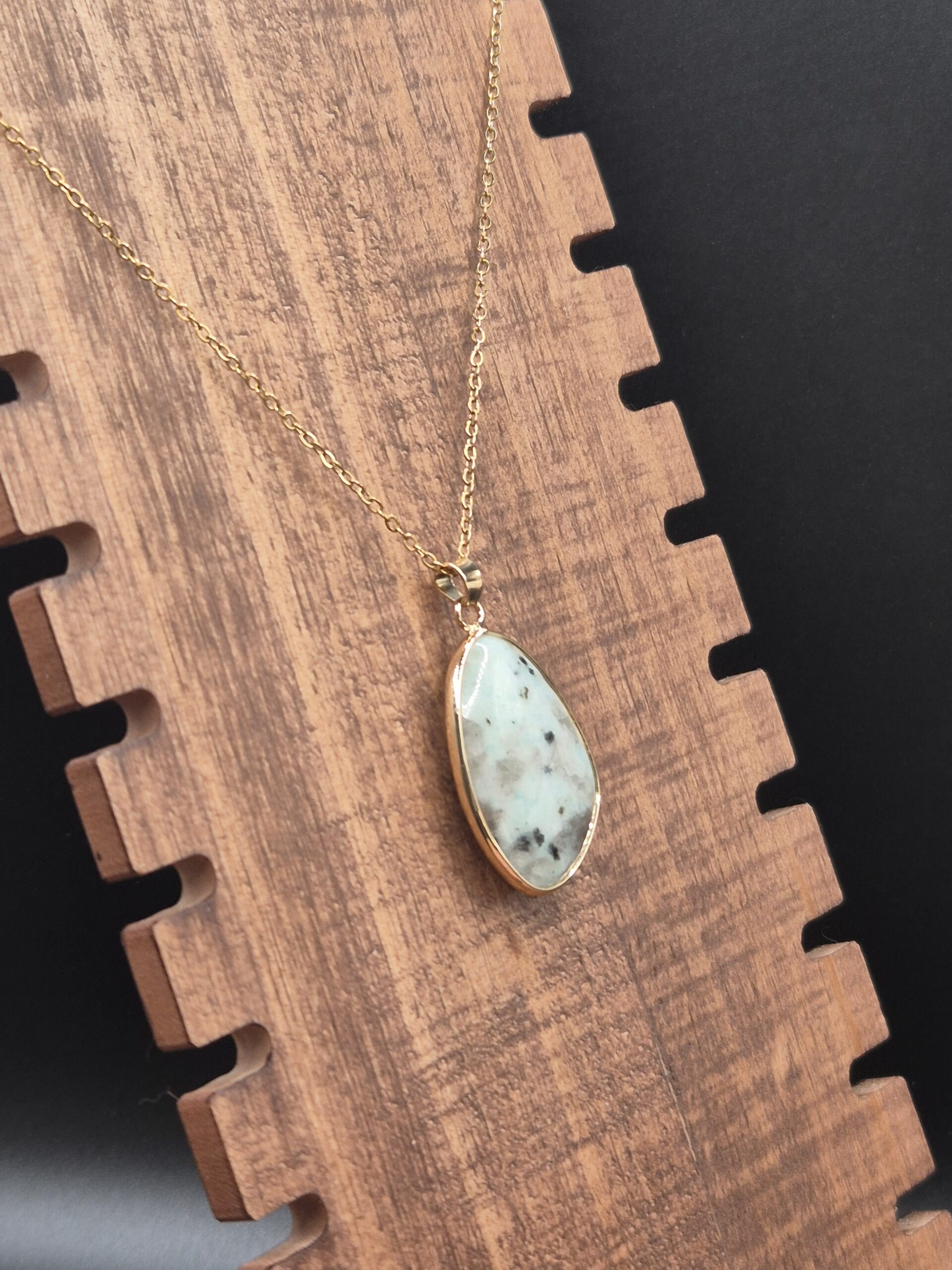 Diese Halskette verbindet einen glatt polierten, eingefassten Dalmatiner Stein