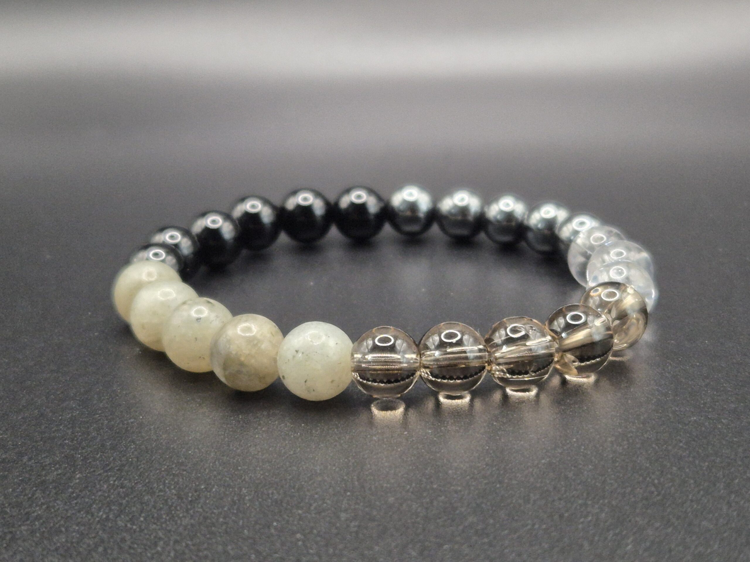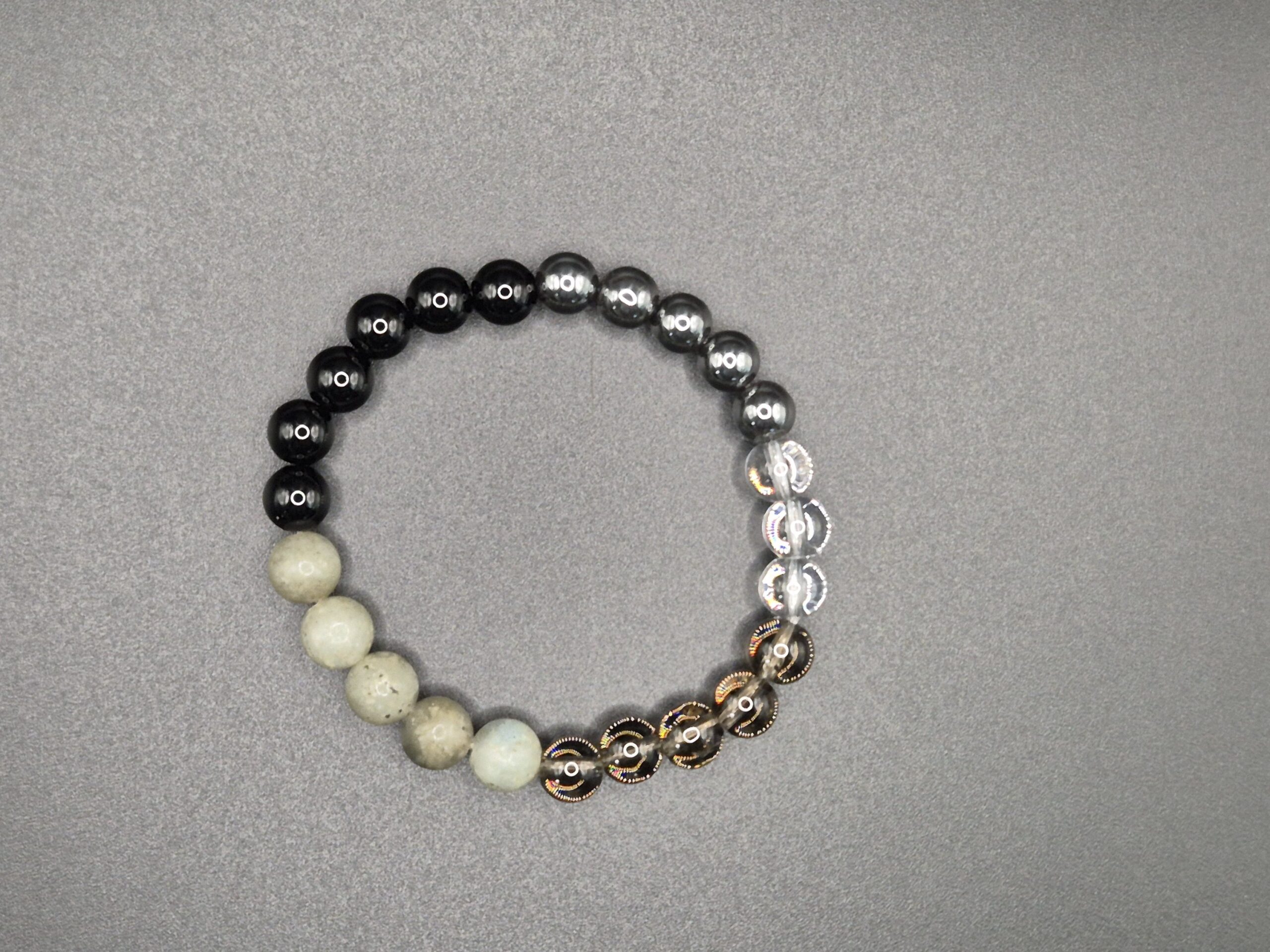 • Steine: Onyx, Hämatit, Labradorit, Bergkristall, Rauchquarz – jeweils 8 mm