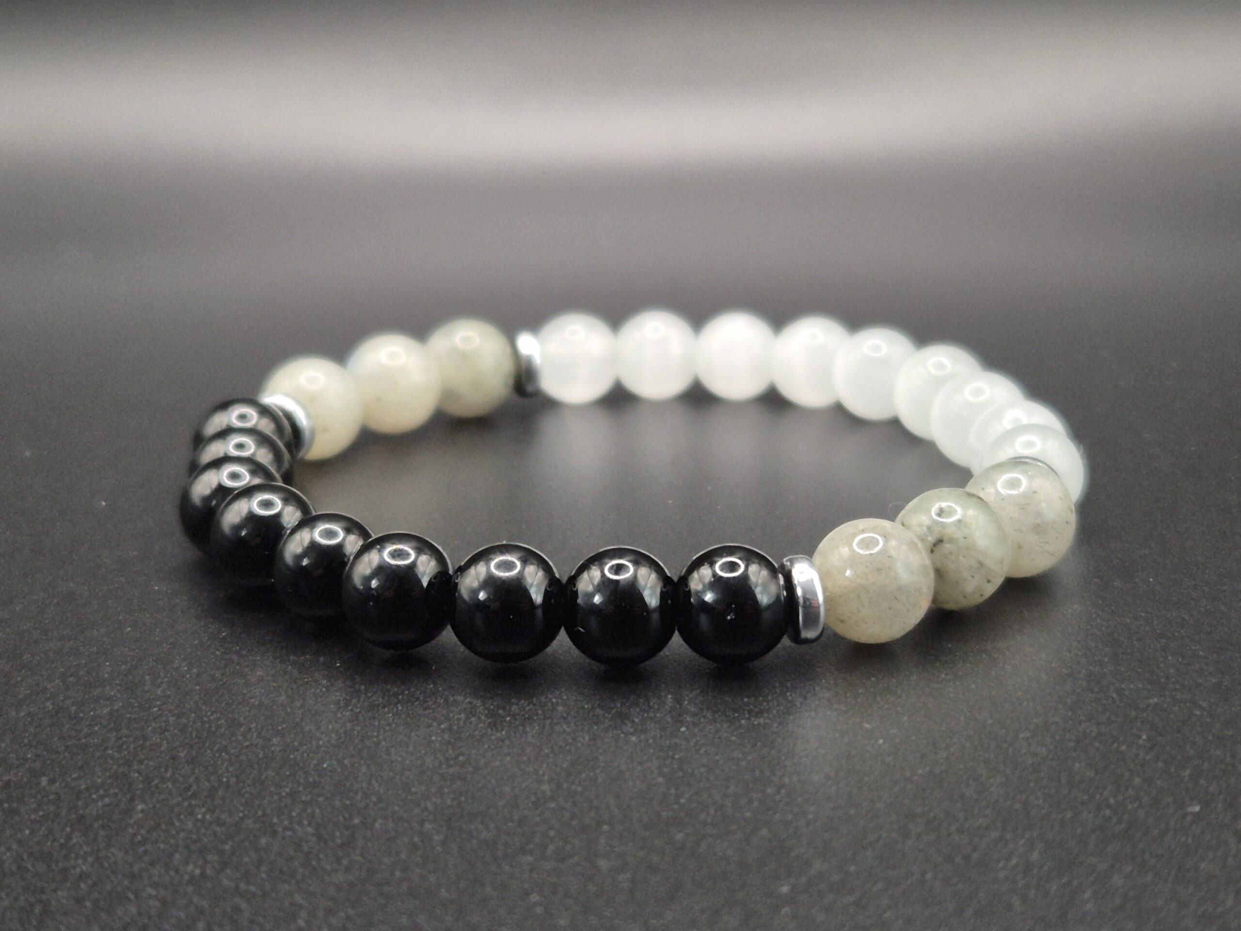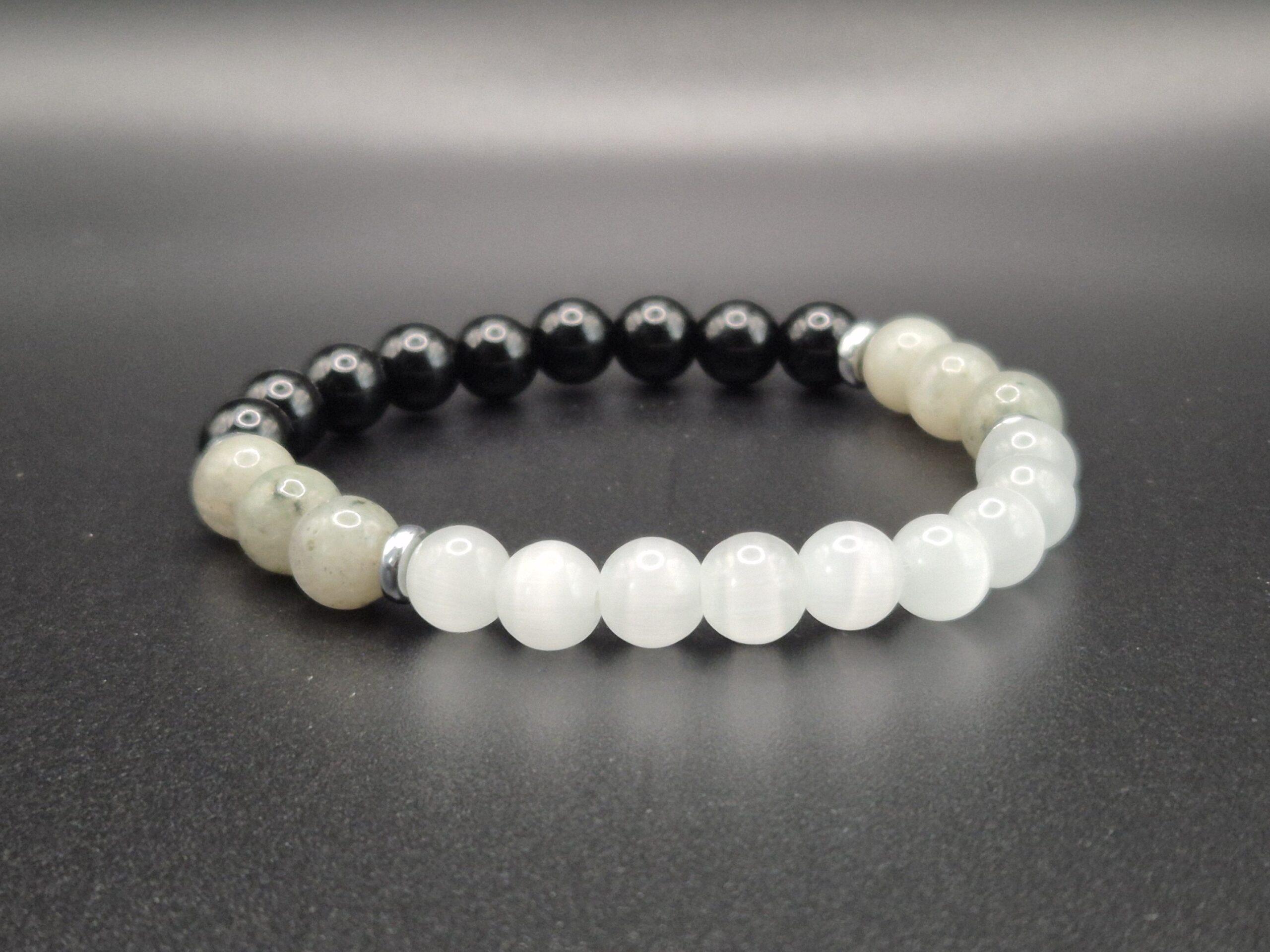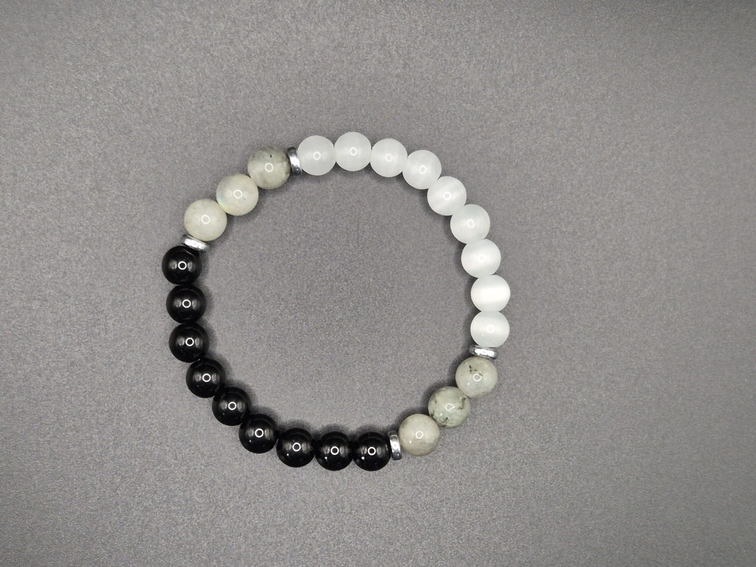 Das Armband „Lichtschutz“ vereint Onyx, Labradorit und Selenit zu einer feinen Schutzkomposition für die Aura. Es steht traditionell für energetische Klarheit, Abgrenzung und lichtvollen Schutz im Alltag.